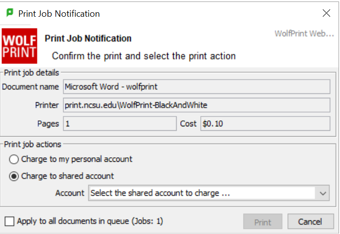 2. For Mobility Print, send your print job from the desired application to a WolfPrint FollowMe printer. Next, login to the PaperCut Web Client (https://go.ncsu.edu/wolfprint), and under Print Job Actions, select the radio button "Charge to Shared Account" and then choose an available shared account from the drop down list.
