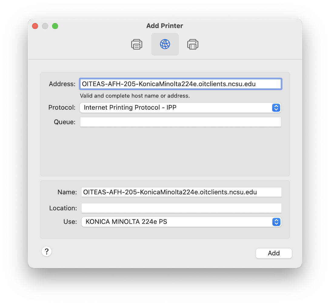*In the event you are unable to use the full name of the printer you may use the IP address of the printer, which can be found by printing a configuration page directly from the printer control panel.