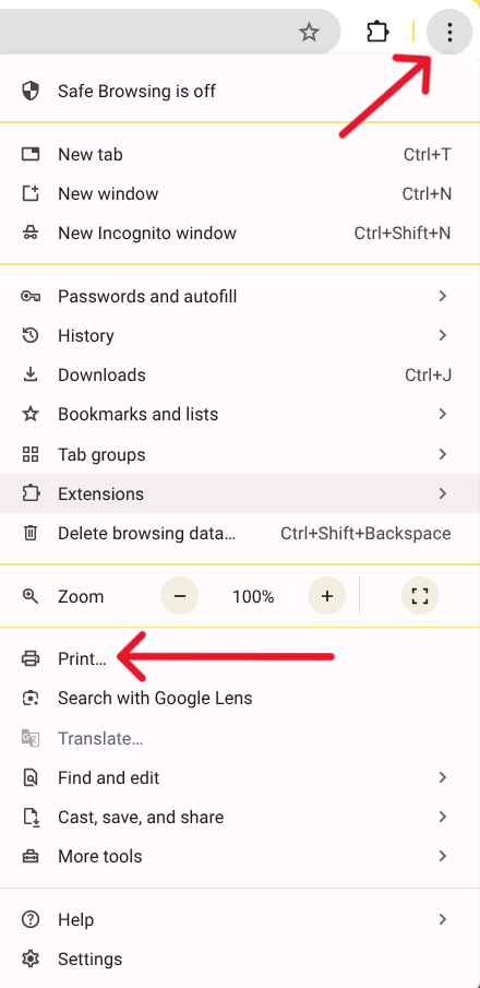 - Click the three-dot menu in the browser and select "Print", or Press Ctrl + P on your keyboard.