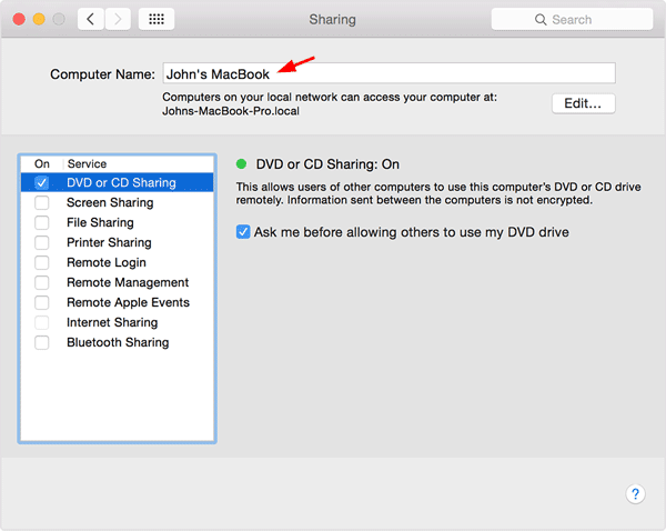 The Computer Name for your Mac appears at the top of Sharing preferences.