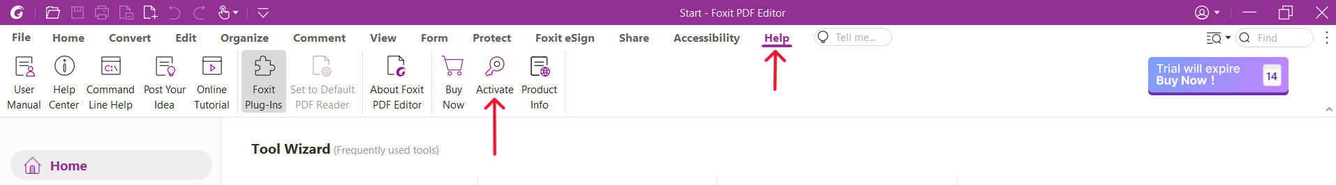 If you are inside the Foxit application, you can activate your license by selecting the Help menu, and then the Key labelled "Activate".