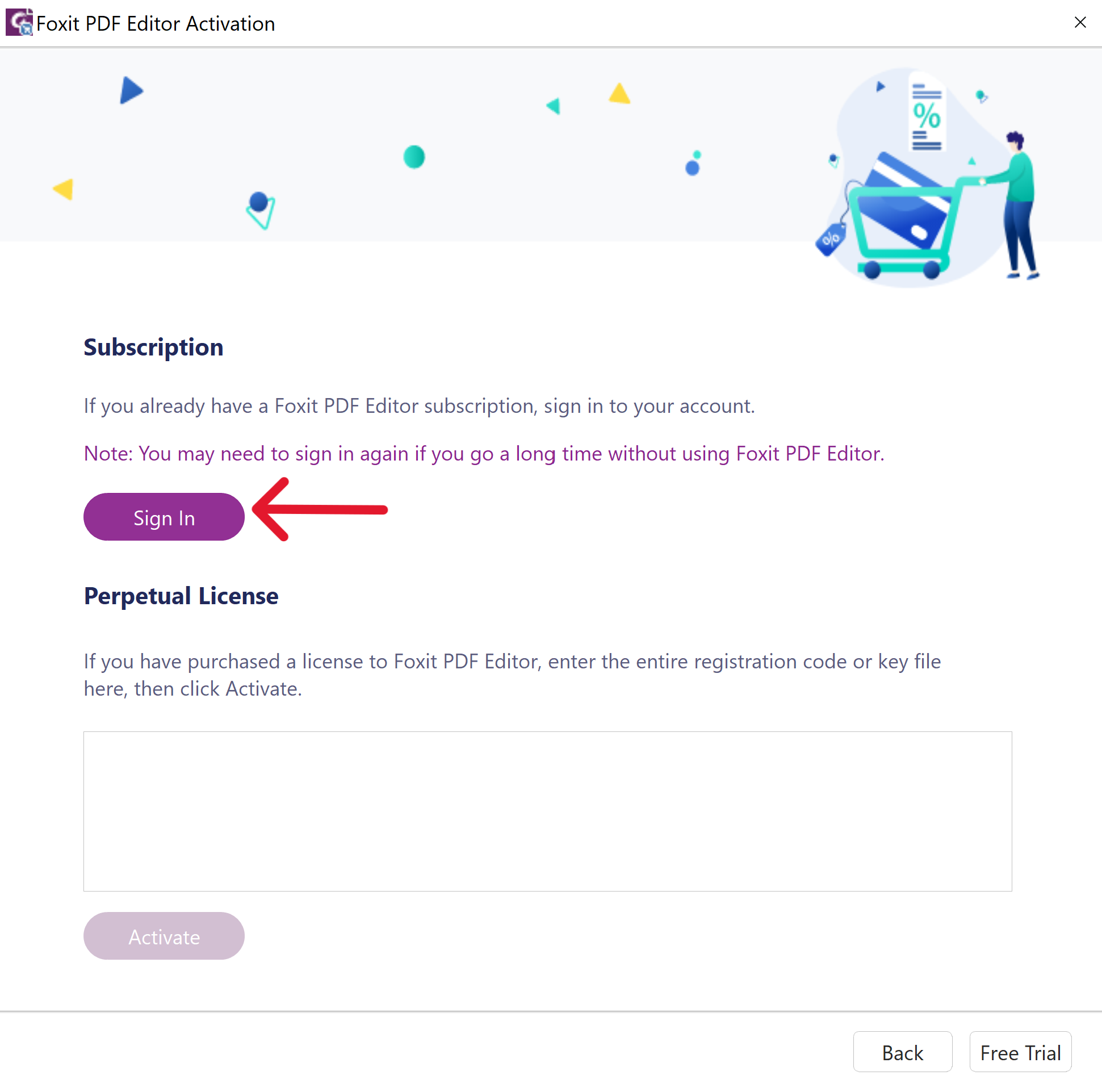 You will reach a page titled "Foxit PDF Editor Activation" - please click the "Sign in" button.
