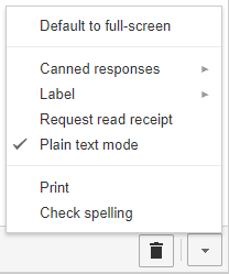In the menu that appears as seen above, click Plain text mode.  If you click the "3 vertical dots" button again, you'll see the check next to "Plain text mode" which lets you know you are composing your email in plain text.