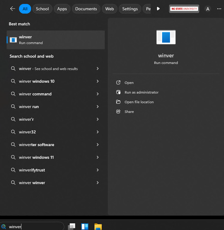 Step 8: Your computer will then shut down and restart. Once the computer is restarted, and you have logged back into it, check the current Windows Version of your computer by looking up “winver” in your taskbar to see if the 23H2 update has been installed: