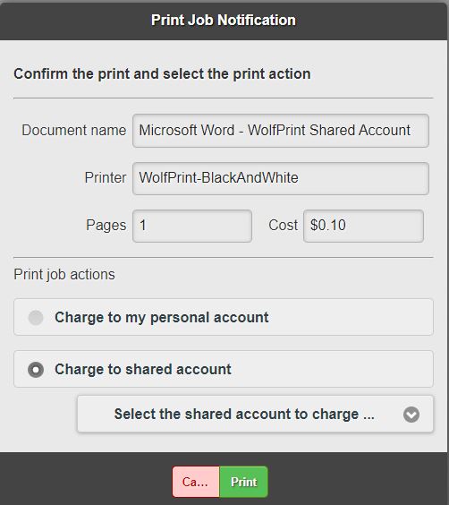 1. For standard printing on a computer running the PaperCut client, send your print job from the desired application to a WolfPrint FollowMe printer.  In the PaperCut Print Job Notification pop-up,  select the radio button "Charge to Shared Account" and then choose an available shared account from the drop-down list.