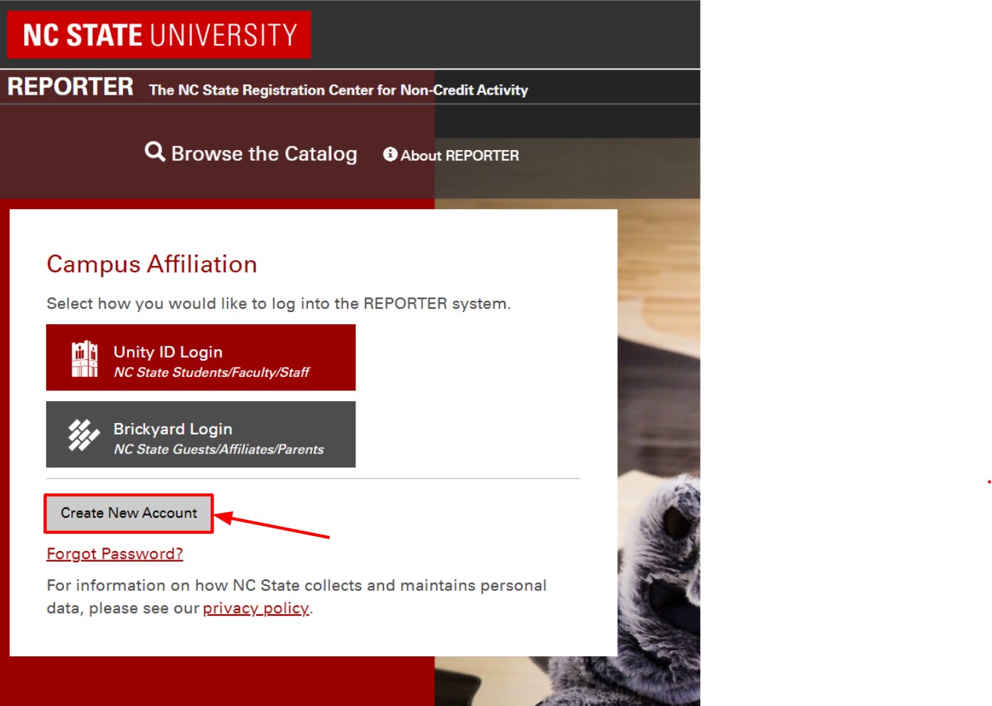 Users unaffiliated with NC State University (e.g. not a student, faculty member, or staff member) can create a Brickyard account to register for non-credit activities in Reporter.