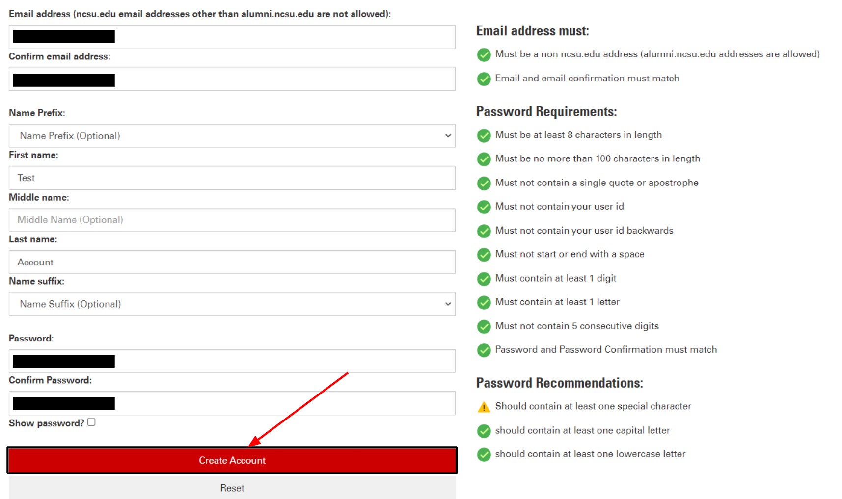 - Note: The Create Account button will be gray-ed out until all of the email address and password requirements are met.