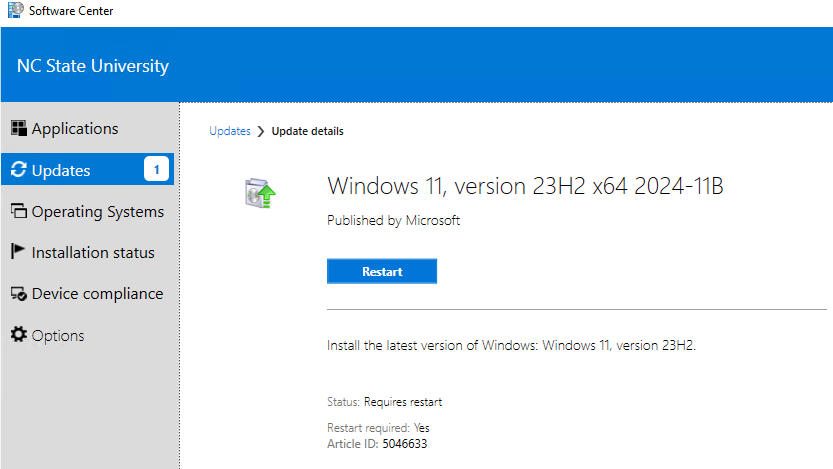 Step 5: The upgrade should start installing.  Do not interrupt it.  You will get a notification from Software Center saying “Restart required”, as shown below: