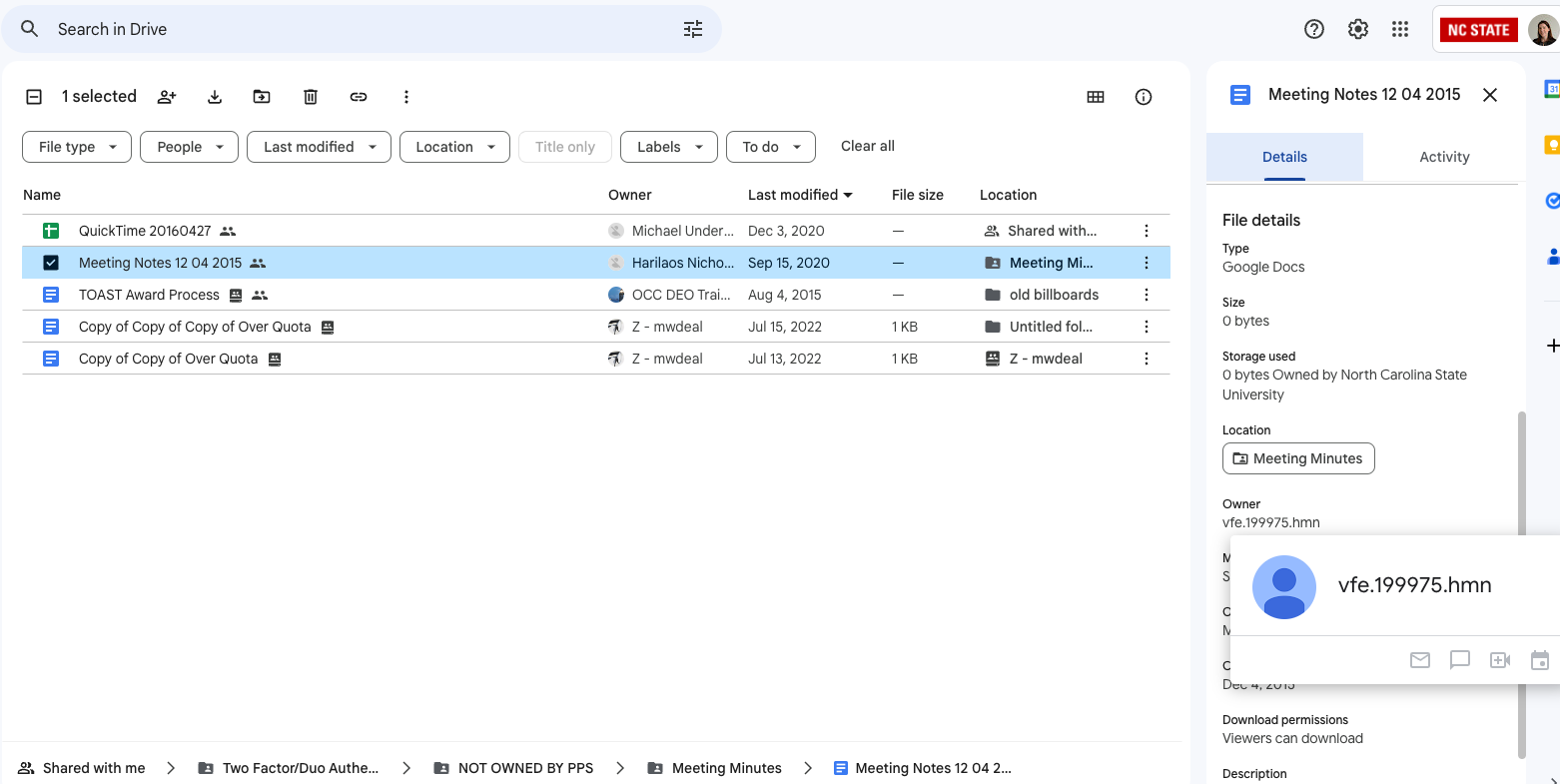 One of the primary concerns for many users when discussing clean up (deletion) of files in NC State’s Google domain is the possibility of losing access to documents not owned by them, but owned by a suspended account (i.e. alumni or former employee/VFE’d account). Content in Google Drive owned by suspended accounts will eventually be deleted. Unfortunately there is no easy way to determine these files except for some hard work, patience, and time.