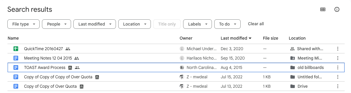 - Review files by user if possible. That way you could know that all of an individual’s files can be ignored. Reference Advanced Search options in Drive.