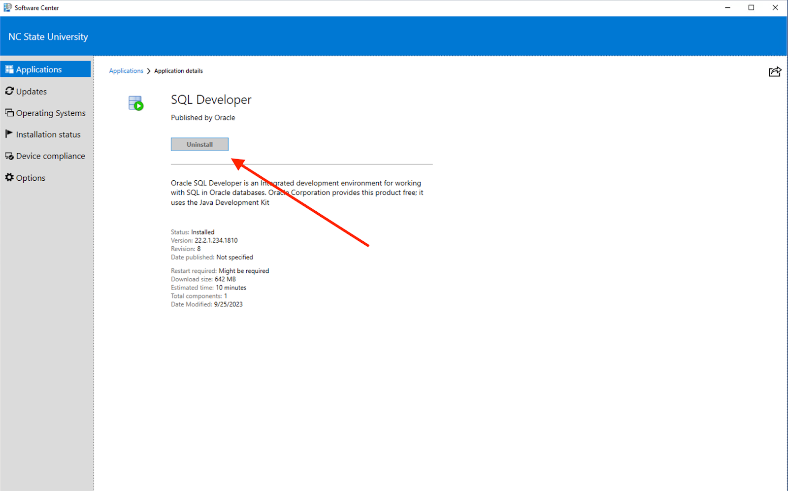 Once the “SQL Developer” installation process is complete, you should see the word “Uninstalled” displayed under the installation status in the Software Center.