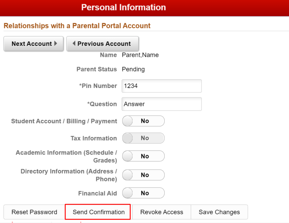 - Under Relationships with a Parental Portal Account, make sure you have selected the proper account.