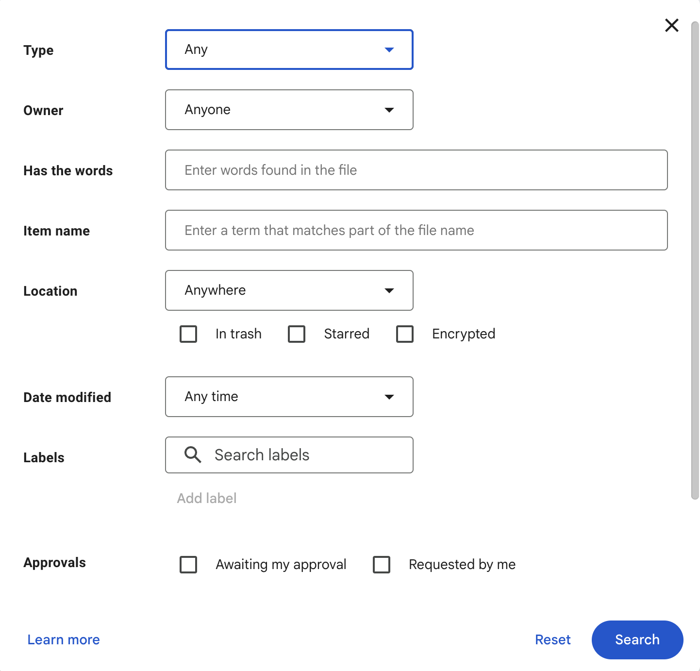 - Review files by user if possible. That way you could know that all of an individual’s files can be ignored. Reference Advanced Search options in Drive.