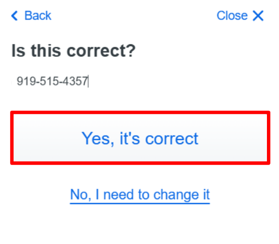 - When it asks if you if your phone number is correct, select Yes, it's correct if your phone number is listed correctly.