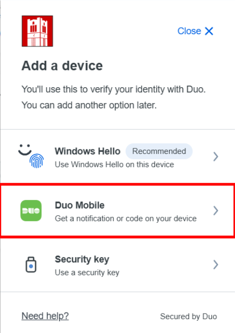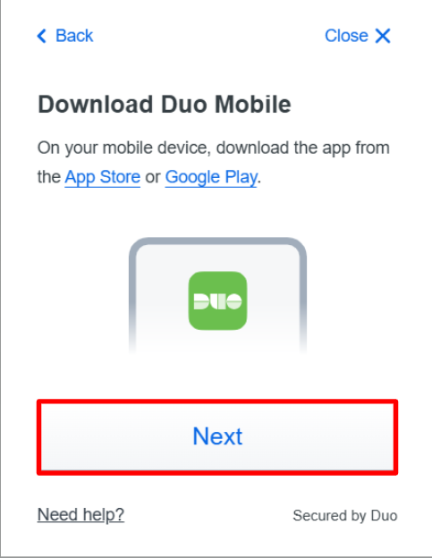 - Install Duo Mobile from your device's app store if you haven't already. Then, select Next.