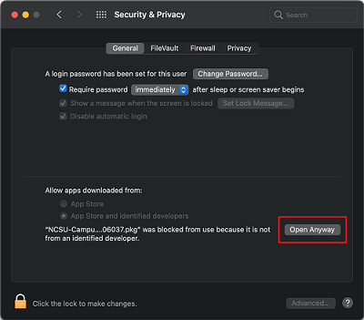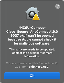 If you try to install the Cisco AnyConnect VPN client in macOS and see the message that the file can't be opened because Apple cannot check it for malicious software and the software needs to be updated, you will need to confirm your intent to open or install the app.