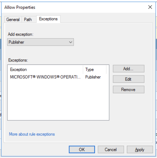 Since AppLocker is designed as an allow list, in order to use it as a blocklist tool, we would create a rule for the executable type in question (AppX,exe, dll, script), and "Allow all" for everyone with an exception for the target application. Rules are defined in Group Policy under Computer Configuration\Policies\Windows Settings\Security Settings\Application Control Policies\AppLocker. An example rule configuration designed to block Notepad is included in the screenshots below. A new GPO would have to be created and linked by the appropriate OU Admin where needed.