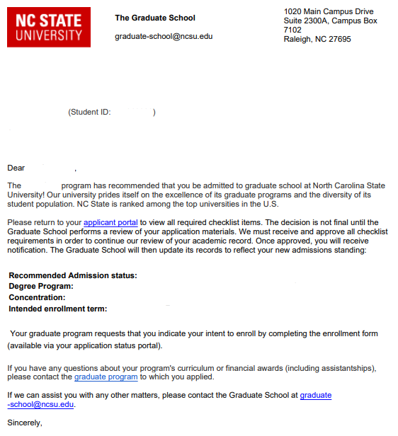 If you received a letter from the Graduate School regarding a recommendation for admission (see image below) that only contains a Student ID number but no Unity ID username or Default Password, this typically means that further tasks must be completed in the Applicant Portal before the admission is complete and a full Unity Account is created. You will not be able to log in anywhere only using the Student ID number. Once you have completed your checklist in the Applicant Portal, your Graduate School department will send you further admission and login details. Any questions regarding how to complete the Applicant Portal check-list, obtain a Unity ID, or when further admission details can be expected should be directed to the Graduate School.