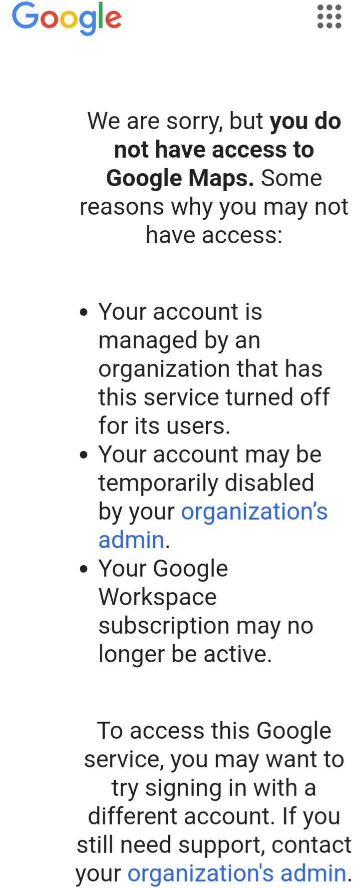 Android phones using @alumni.ncsu.edu accounts may sometimes start presenting the user with repeated notifications indicating "We are sorry, but you do not have access to [Google App]." This will occur for apps which users are not signed in for on their alumni accounts. An example message from Google Maps is below, but please note that it can seem to happen on all Google apps on Android.