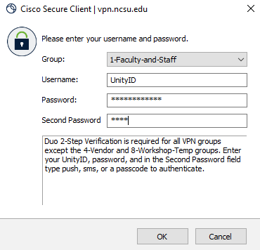 If you have access to VPN, then you can connect to the NCSU VPN by following the instructions below. To install the Secure Client, see How Do I Install the NC State VPN Client?