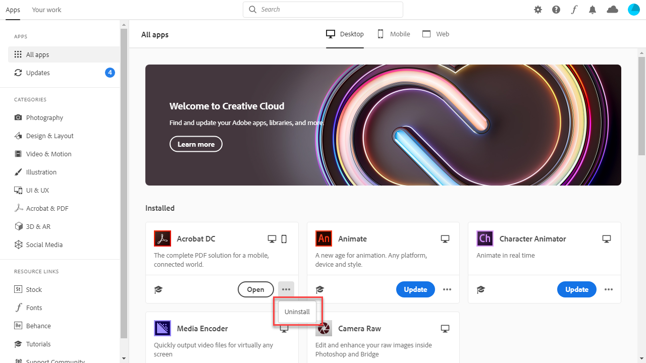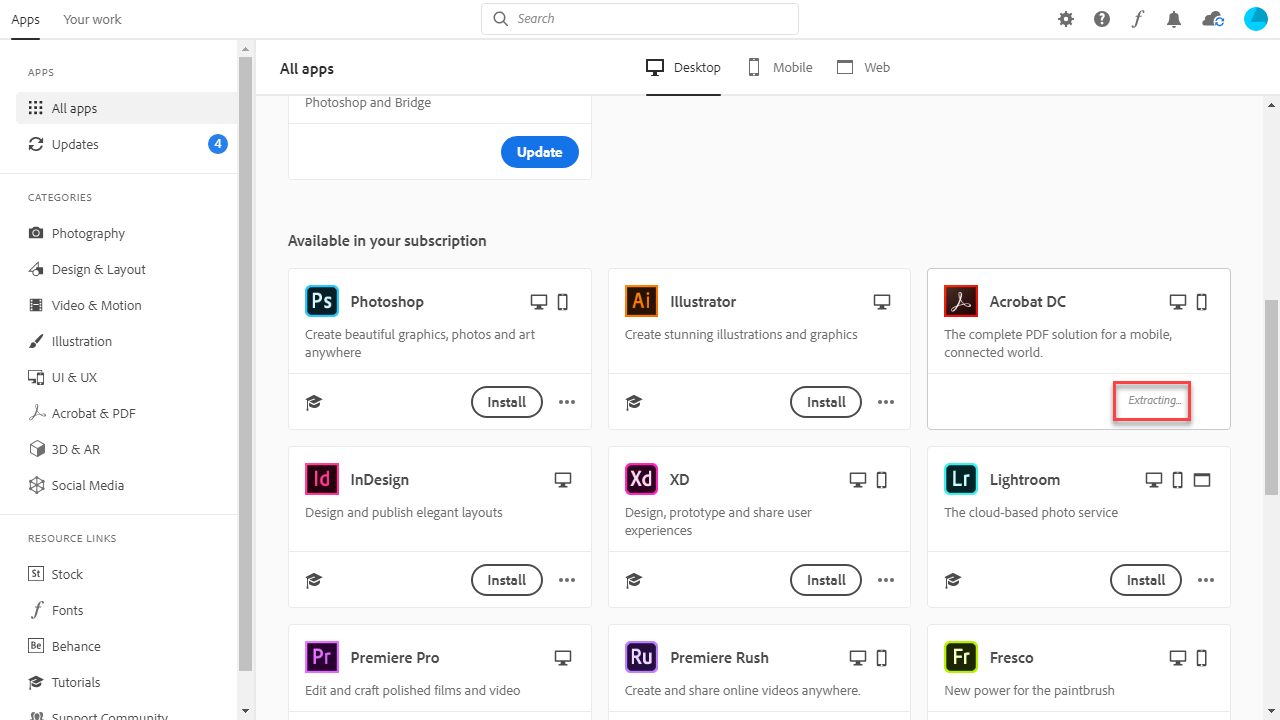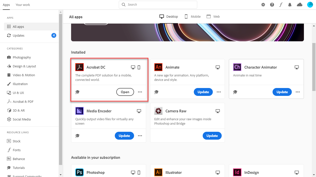 4. Complete! Once finished, you will see your Application re-populate in the Installed category. You may now Open the freshly installed Adobe Application.