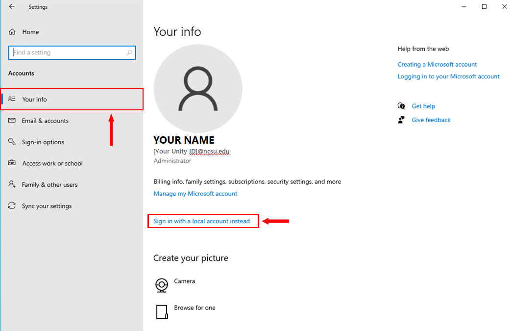 If you signed in to your NC State-designated Microsoft account on a personal Windows 10 computer and you'd like to remove this account, you will need to follow the steps below. If you no longer have access to your NC State Microsoft account, you'll need to contact the NC State Help Desk by phone at (919) 515-HELP (4357) for support.