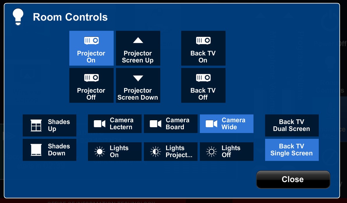 In every ClassTech-supported Zoom and Panopto-enabled Classroom, there are 3 camera presets to select, all of which are available from the room’s touch panel. To change the camera’s preset, select the “Room Control” button via the light bulb icon on the right side of the touch panel to populate the control window.