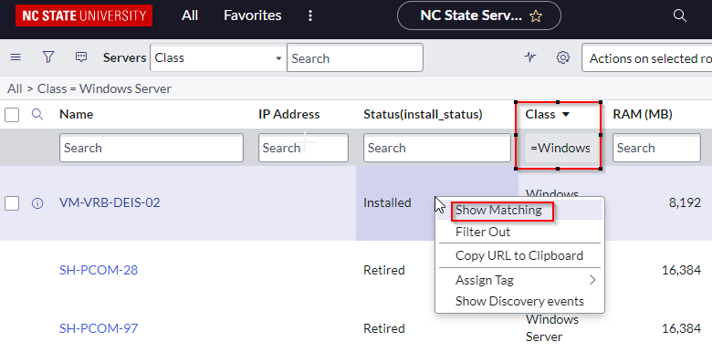 If you want to see/filter records for something specific, right-clicking on "Installed" or the "Class" and selecting "Show Matching" under the Status column will return all Servers with the Status of "Installed":