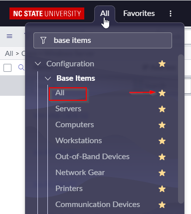 In the Filter Navigator box, type "Base items" and then click on "All" under the drop-down list or specific class under the "Base Items -> All, Servers, Computer, Workstations, Network Gear, etc.. ".