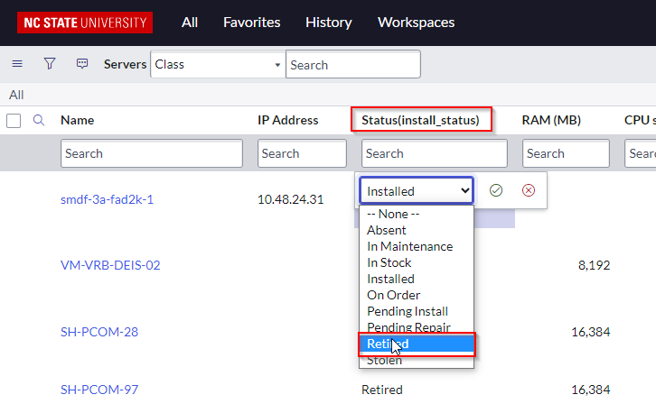 Then you can select the right CI and change the status to Retired or Installed. See the example below,