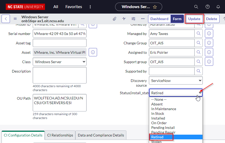 Or click the CI name to open the Form view and change the Status field to "Retired or Installed" then click the "Update" button to commit changes.