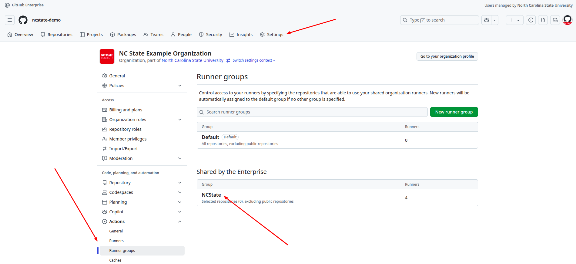 The Runners will also need to be permitted for the repositories in the organization settings before they will process workflows. To enable the NC State Hosted Runners for use in your organization, navigate to your organization settings, open the Runner Groups page under the Actions section, and click on the NCState group under "Shared by the Enterprise".