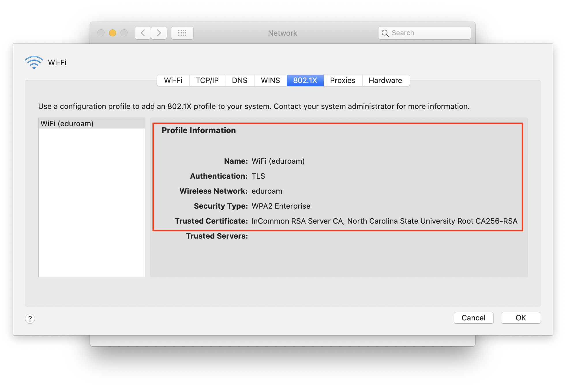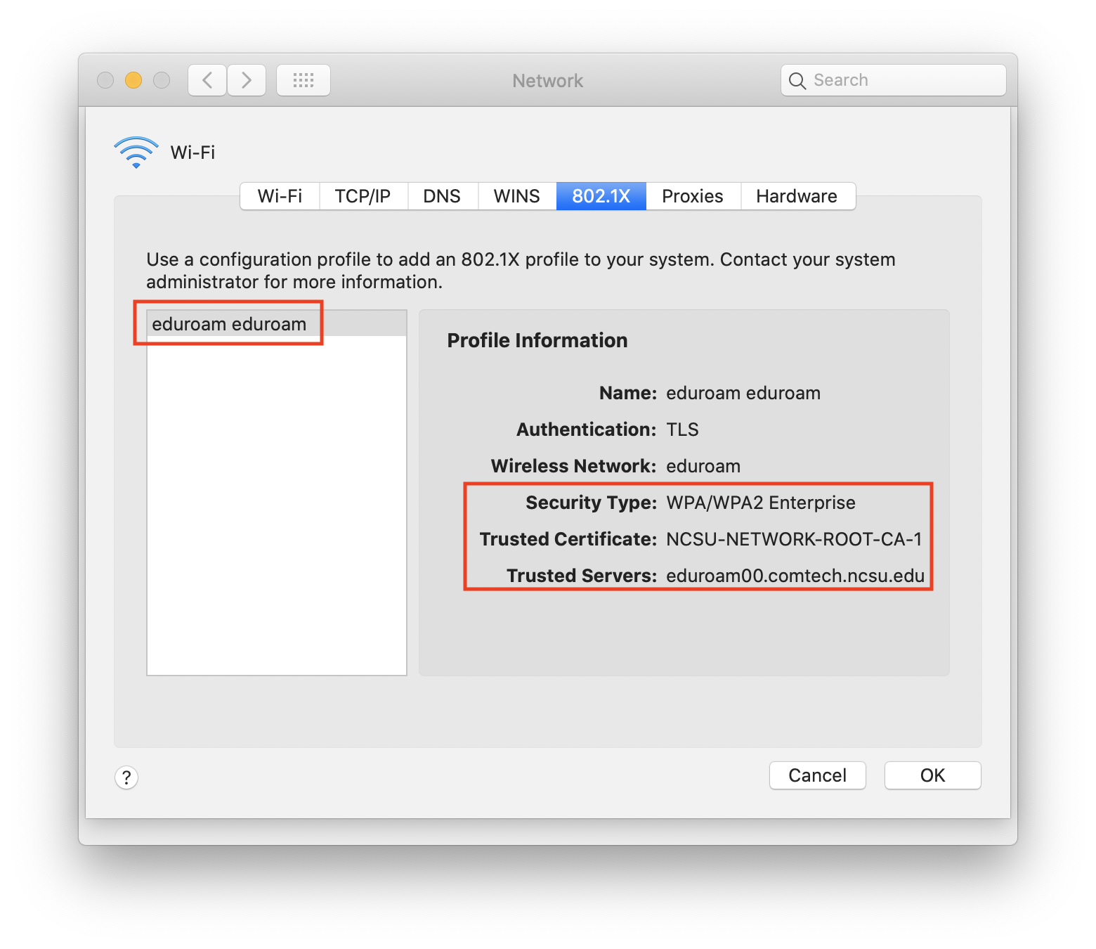 This article provides instructions as a guide to join a participating institution’s eduroam network if you are using the eduroam device certificate deployed by your IT support unit.  All eduroam information and processes can also be found on the primary service page for eduroam at NC State.