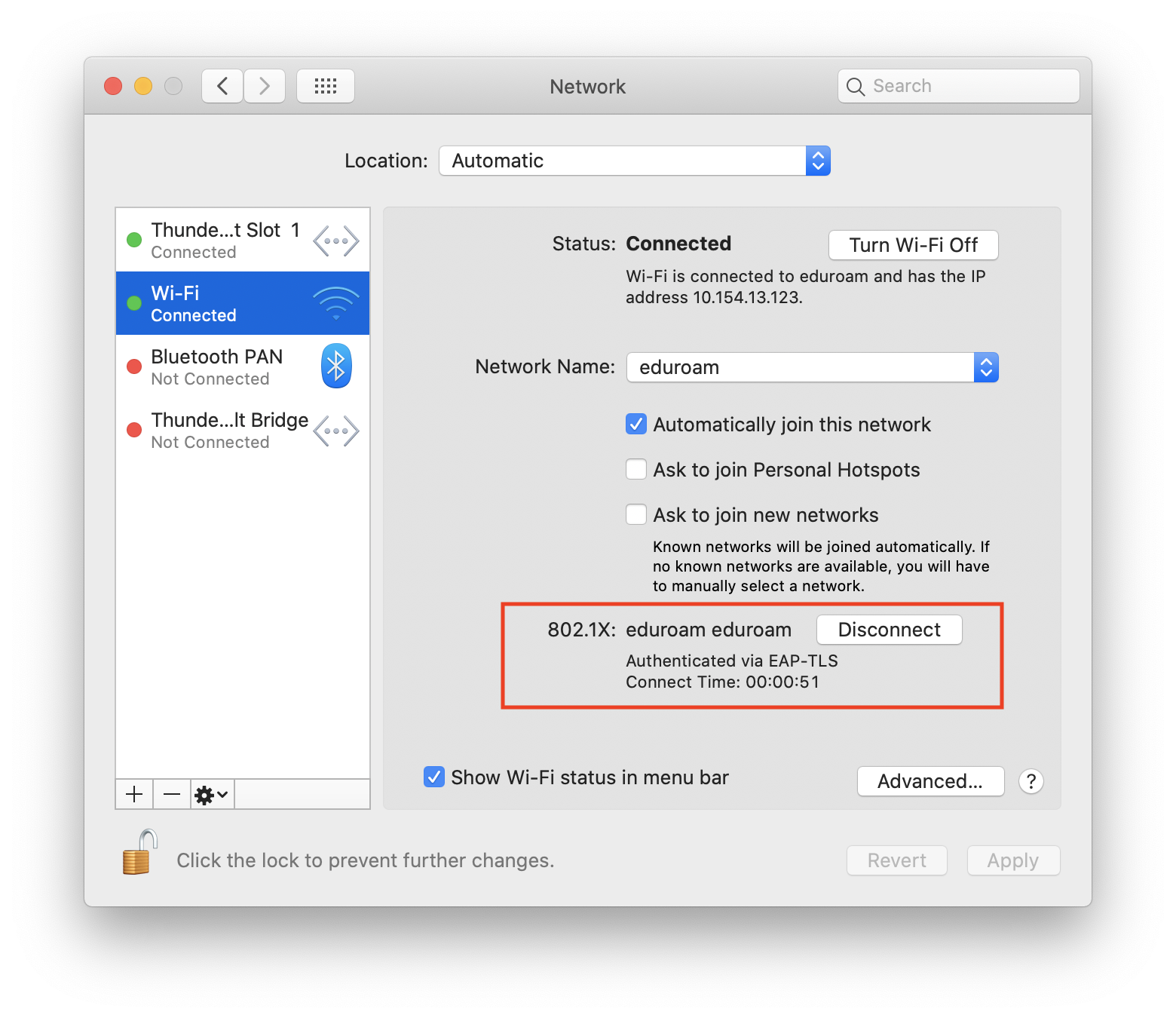 Once your macOS computer receives the eduroam (Device) configuration profile from our Configuration Management System (CMS), and if Wi-Fi is enabled, your computer will automatically authenticate and connect to the eduroam wireless network if in range.  macOS provides a few different graphical ways to confirm you are connected and verify correct configurations if troubleshooting is required.