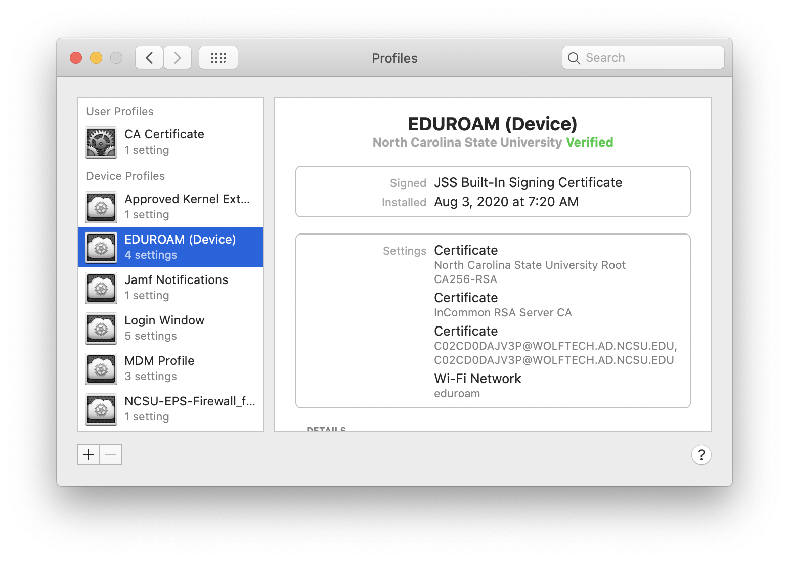 In order to build NCSU’s cybersecurity practices and adhere to policies, this process and continued use of the eduroam network enhances endpoint compliance for with RUL 08.00.18 – Endpoint Protection Standard requirements for use of encrypted networks on Macintosh laptops in the OIT Managed Desktop Service environment.