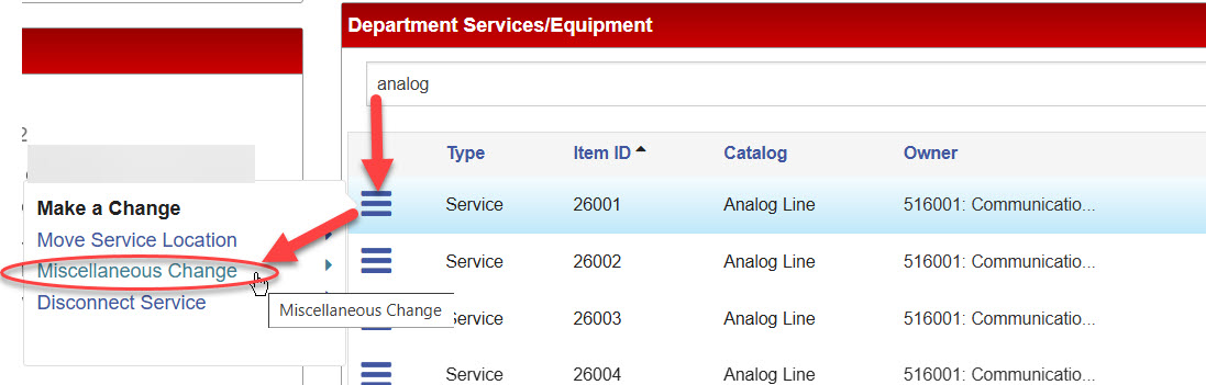 - On the Customer Center's home page, in the Department Services/Equipment section, search for the service you wish to change.