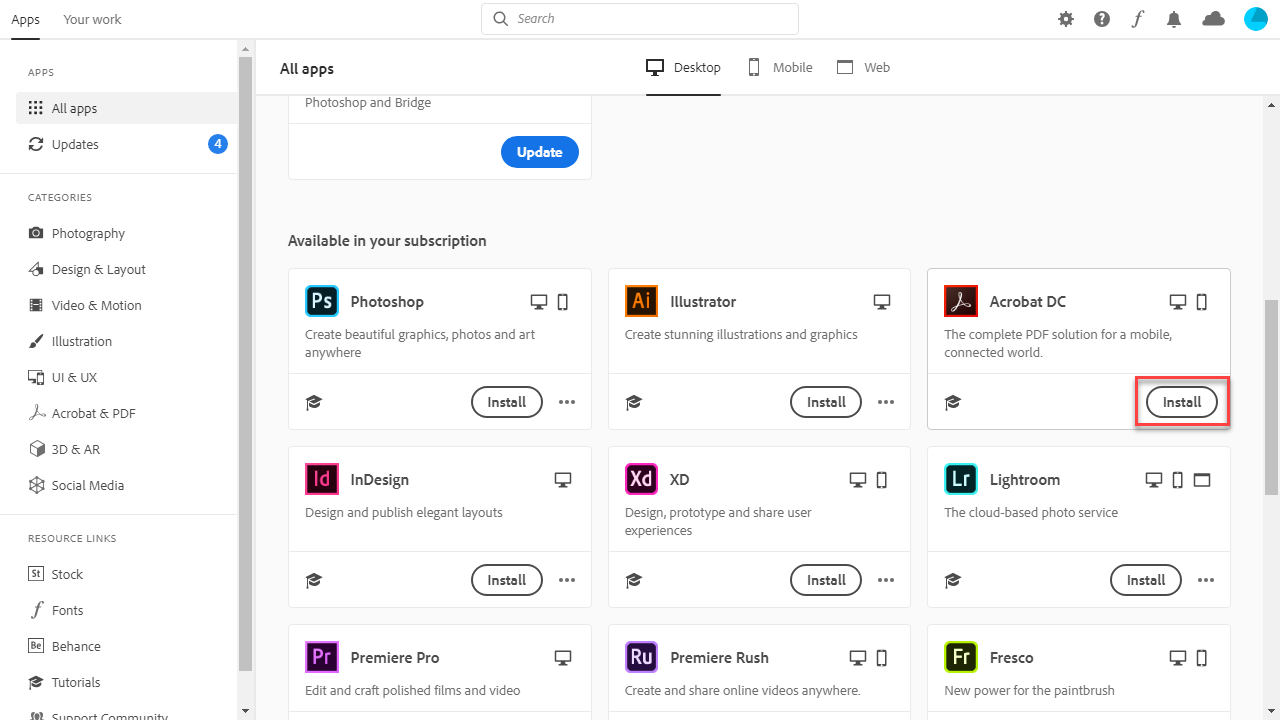 4. Complete! Once finished, you will see your Application re-populate in the Installed category. You may now Open the freshly installed Adobe Application.
