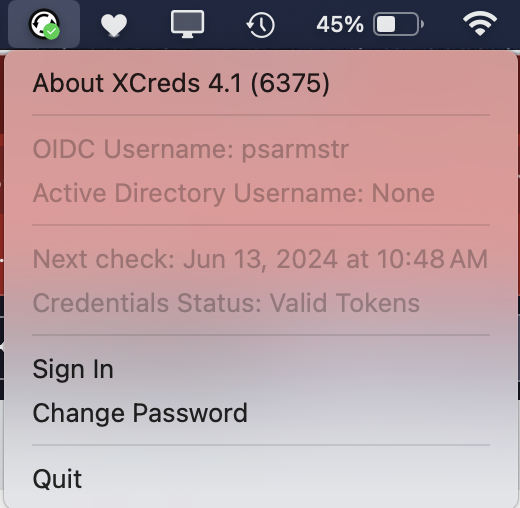After the computer restarts, log back in, and look for the XCreds icon in the menubar. There should be a green dot indicating the application is active, and monitoring for password updates.