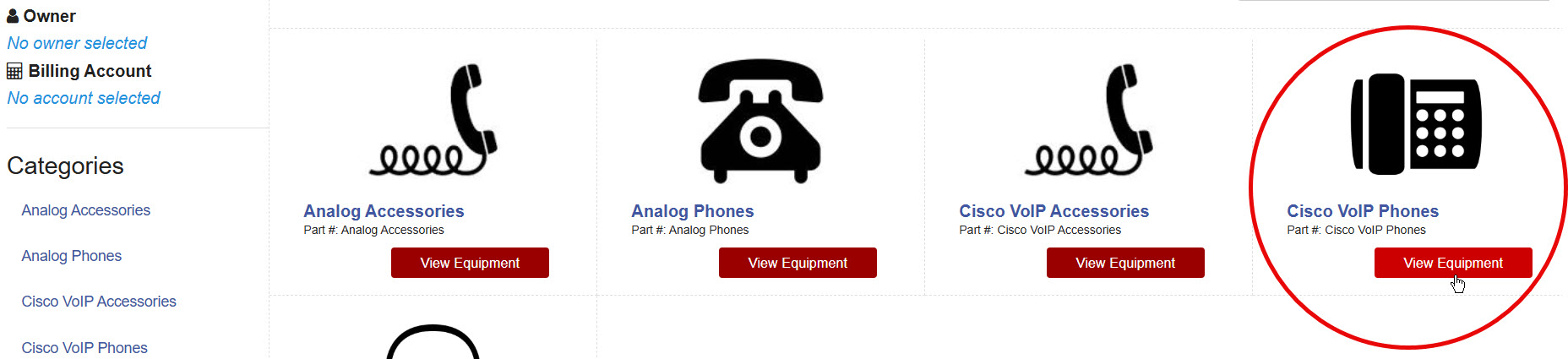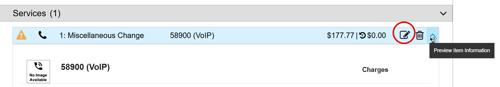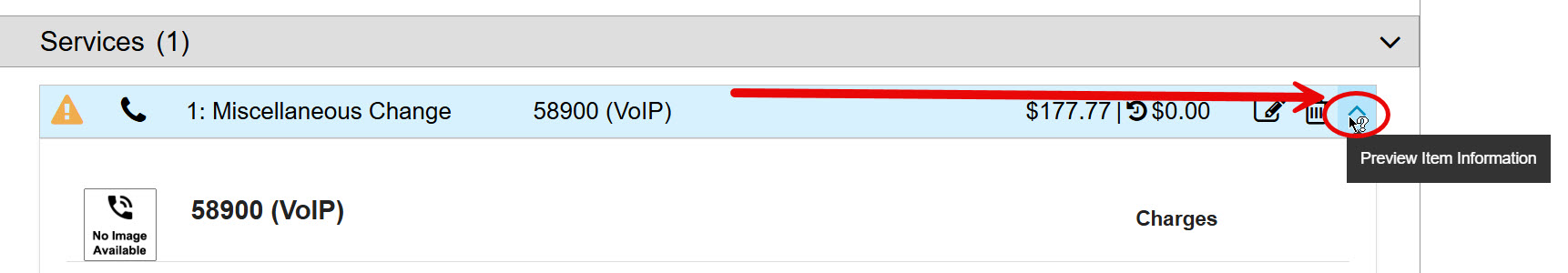 - You will see all of the current information about the Service (phone line) in the upper section of the details, and the Equipment is displayed in the lower section, along with the one-time cost of the equipment.