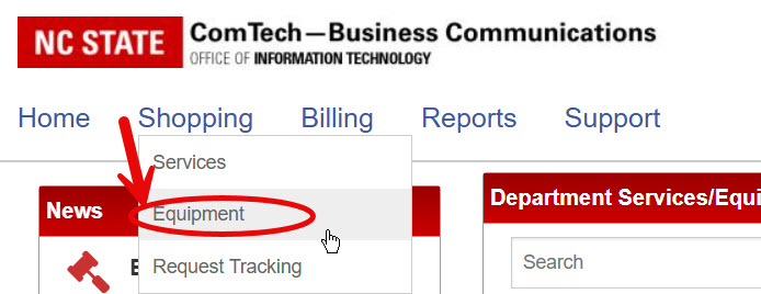 - Next, hover over the Shopping menu and select Equipment to open the Equipment Catalog Categories page.