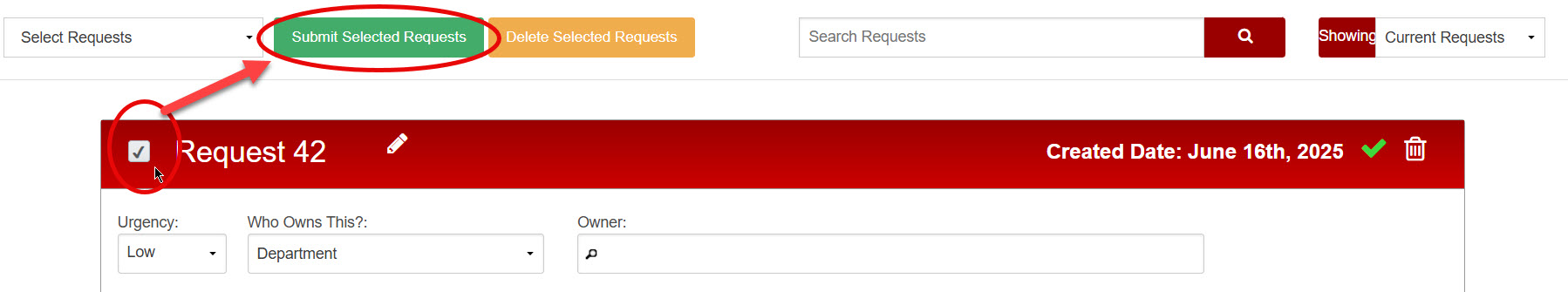 - The Request is now ready to submit. To do so, tick the box next to the Request Title and then click the green Submit Selected Request button at the top of the page.