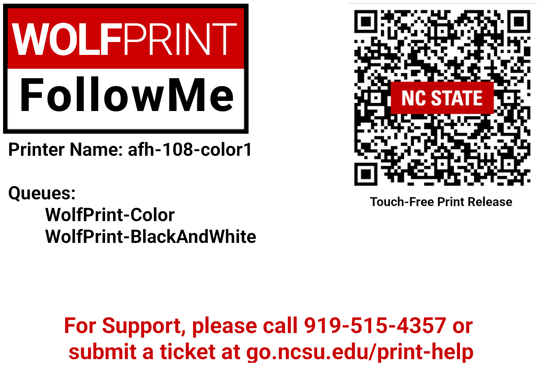 - The printer will be clearly labeled with a WolfPrint FollowMe logo, the printer name, supported print queues, and a QR code for Touch-Free Print Release.